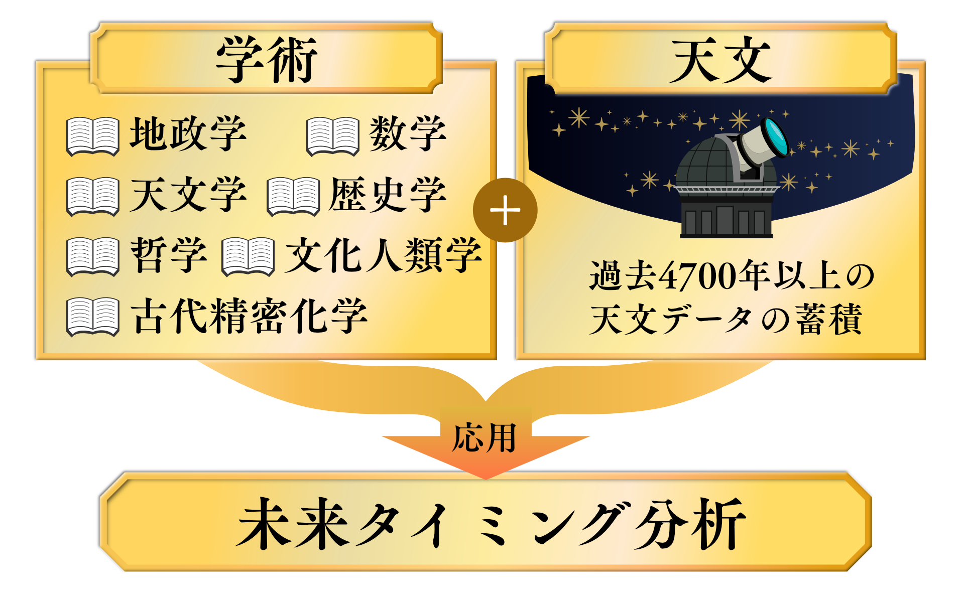 前述の未来タイミング分析が天文観測データと複数の学術を用い、事業の好調・不調の時期や成功確率の高い日時を予測する事に特化したもので、戦略的タイミング解析は分析の結果を基準に、企業の過去の統計データや市場調査結果などを加味して、具体的な施策を立案するものです。